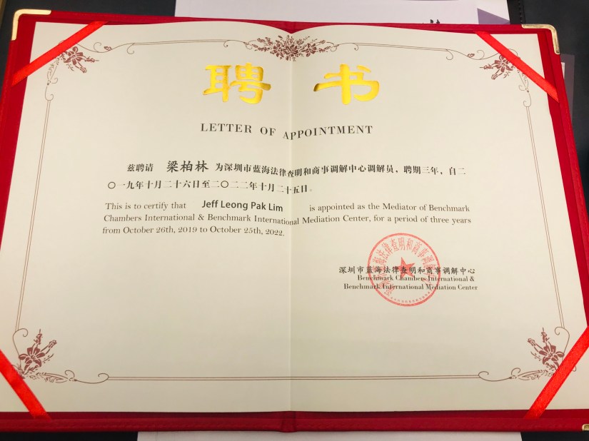 At a Mediator Appointment Ceremony this morning (2 November 2019) at the sidelines of the Fourth Qianhai Legal Intelligence Forum on “International Commercial Mediation: International Experience And Chinese Practice” in Shenzhen, China, JLPW Senior Partner Jeff Leong was formally appointed a Mediator of Benchmark Chambers International (BCI) and Benchmark International Mediation Centre (BIMC).