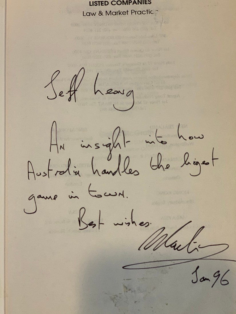 Like Martin K Earp and his book on Listed Companies: Law and Market Practice in Australia, which provided some guidance on Australian practices in my work in developing the Due Diligence Practices for Public Offers Of Securities which subsequently was adopted by our capital markets in 1999 as the industry standard for Malaysia.